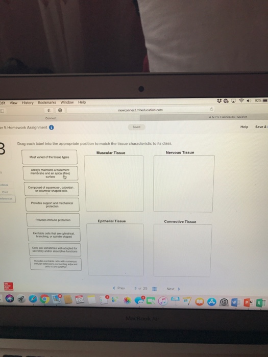 AHCD1010HWSOL4.pdf - 4. Award: 1.00 point Problems ... - Course Hero Adjust credit for all students. Drag each label into the appropriate position to match the tissue characteristic to its class. Explanation: Even though trillions of cells can be found in the human body, they belong to approximately 200 cell types, which can further be organized into tissue types based on location, shape, origin, and function. homework 5 Flashcards | Quizlet Drag each label into the appropriate position to match the tissue characteristic to its class. fibers: - collagen - reticular - elastic - responsible for the flexibility of bone - resists tensile forces ... Drag each label into the appropriate position to identify whether the statement is true or false about the specimen pictured below ... A&P Chapter 11 Nervous System 2 Homework - GraduateWay Determine whether the following descriptions apply to sensory nerves, motor nerves, or mixed nerves (both sensory and motor). Place each cranial nerve label in the appropriate category, describing its function. Label the terminal branches of the brachial plexus. Label the structures of the central nervous system and their protective structures.