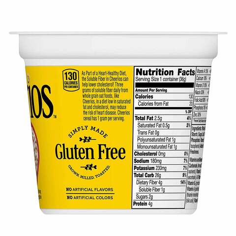 PDF Cereal Cheerios - School Nutrition and Fitness * Nutritional information is subject to change. See product label to verify ingredients and allergens. Cheerios™ Bowlpak Cereal 1oz Whole Grain Oats - First Ingredient. Toasted Whole Grain Oat Cereal in ring-shaped pieces. Provides 12 vitamins and minerals, and one gram of sugar per bowlpak. 1 oz eq grain. No Artificial Colors & No Artificial ... dpi.wi.gov › sites › defaultCereals That Meet CACFP Requirements Including Hot Cereals Cheerios Ole* = Rice Chex P ah Little-Bites Total Plain Plain Mini. Ra Plain P ain Big-Bite RAN KES grape at-nuts Store brands: Only the following: Essential Everyday, Food Club, Great Value, Hytop, Hy-Vee. IAA, Kroger, Meijer, our Family, Roundyg, SCMuckS, Shurfine Cr\Sþy any store brand NEW! Crunch mond Crunch Bite Size n frosting only Cheerios™ Cereal Single Serve Bowlpak 1 oz | General Mills Foodservice Home > Products by Category > Cereal > Cheerios™ Cereal Single Serve Bowlpak 1 oz. < Back to Cereal. NEW! BESTSELLER! Cheerios™ Gluten Free Cereal Single Serve Bowlpak 1 oz. 4.7 out of 5 stars. Read reviews for average rating value is 4.7 of 5. Read 20 Reviews Same page link. 4.7. Cheerios Nutrition Label.pdf - Cheerios Nutrition Label... Cheerios Nutrition Label Questions 1) What "nutrition claims" does the product make? This product makes several "nutrition claims", including being made with whole grains. In addition, it also claims that it has no artificial colours or flavours, that it's low in saturated and trans fats, which would help reduce the risk of heart disease.