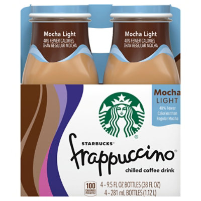 Starbucks Mocha Frappuccino Coffee Drink 9.5 oz Bottles 4 pk. $7.19 ($0.19/oz) Icon details. Product description. A lowfat, creamy blend of Starbucks coffee and milk. A good source of calcium. Indulge your coffee daydream. You'll find it in Mocha Frappuccino coffee drink, a creamy blend of Starbucks coffee and milk, swirled together with our indulgent and chocolaty mocha.