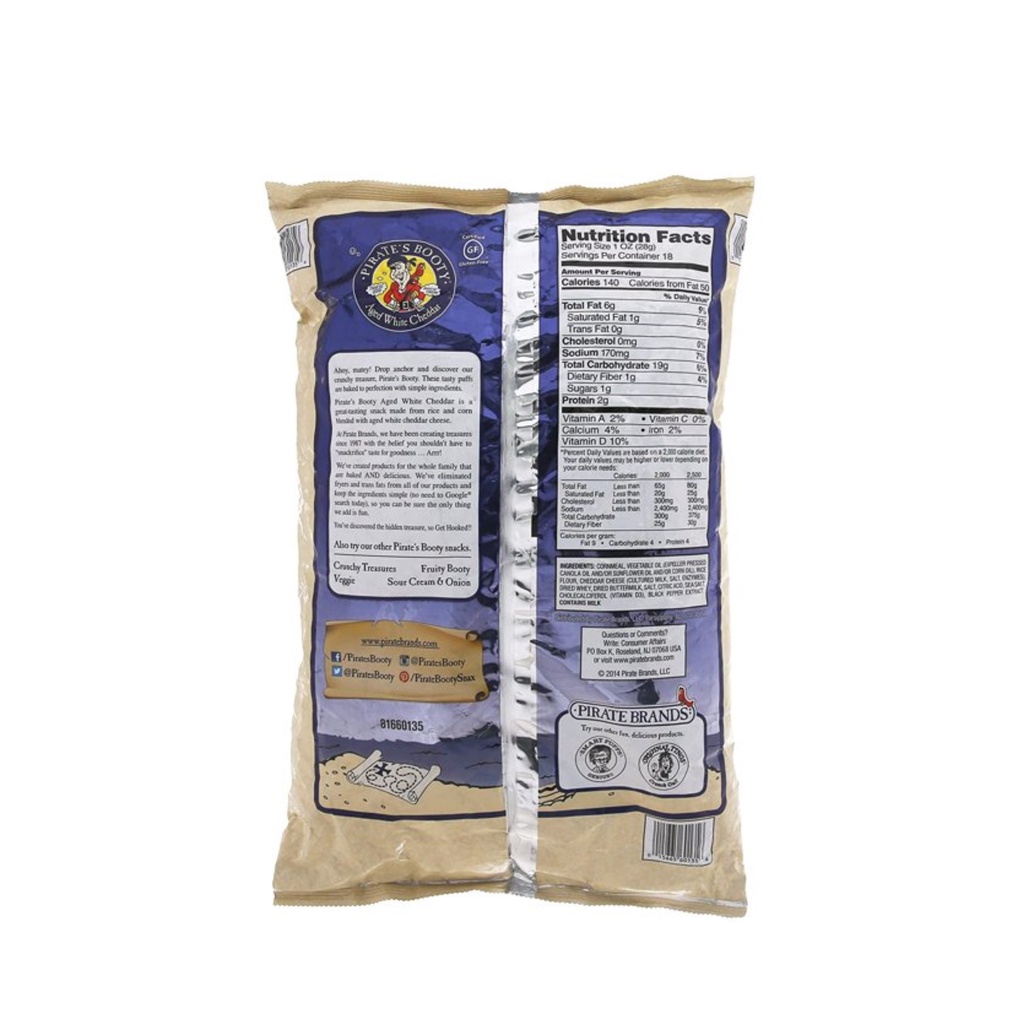 Pirates Booty Aged White Cheddar 10 oz - Allergen Inside Made By: Pirate's Booty. SKU/UPC CODE: # 490710615241. PRODUCT DESCRIPTION: Contains: sunflower, Milk, May Contain: does not contain any of the 8 major allergens ... Nutrition Label. Nutrition Facts. Serving Size 1.00 oz. Servings Per Container 10.00. Amount Per Serving. Calories 130 Calories from Fat 45 % Daily Value* Total Fat 5g. 7.69%. Aged White Cheddar Rice and Corn Puffs - Pirate's Booty Ingredients Cornmeal, Rice Flour, Sunflower Oil and/or Expeller Pressed Canola Oil, Cheddar Cheese (cultured milk, salt, enzymes), Whey, Buttermilk, Salt, Natural Flavor, Sea Salt, Citric Acid and Lactic Acid (for flavor), Organic Black Pepper. Allergy Information Contains Milk ★★★★★ ★★★★★ 4.7 50 Reviews Pirate's Booty Veggie Puffs, 4 oz - Whole Foods Market Find Pirate Brands Pirate's Booty Veggie Puffs, 4 oz at Whole Foods Market. Get nutrition, ingredient, allergen, pricing and weekly sale information! ... Pirate's Booty Veggie Puffs, 4 oz; Pirate Brands Pirate's Booty Veggie Puffs, 4 oz. ... You should not rely solely on the information presented here and you should always read labels, warnings ... Veggie - Pirate's Booty 18 ingredients Ingredients: corn meal, rice, soy flour, contains one or more of the following: (sunflower, expeller pressed canola or corn oil), rice flour, spinach powder, broccoli powder, carrot powder, evaporated cane syrup, cabbage powder, kale powder, parsley, dextrose, black pepper and sea salt Allergens: Soybeans Food processing